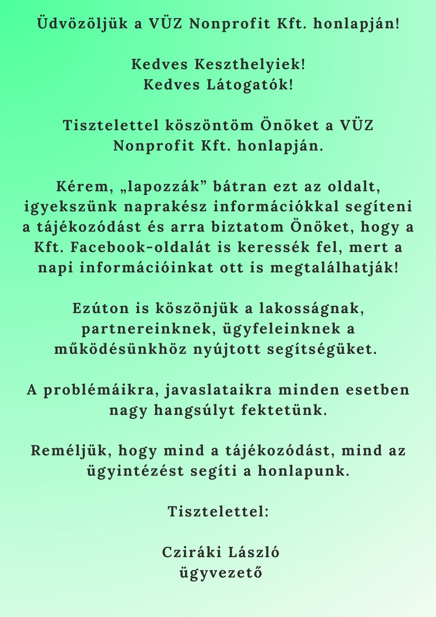 VÜZ Keszthelyi Városüzemeltető Egyszemélyes Nonprofit Kft. jogelődje a Keszthelyi Városgazdálkodási Vállalat 1952. április 17-én jött létre. 1992. 02. 01-től 2011. 02. 28-ig Keszthelyi Városüzemeltető Egyszemélyes Kft. volt a vállalkozás neve.